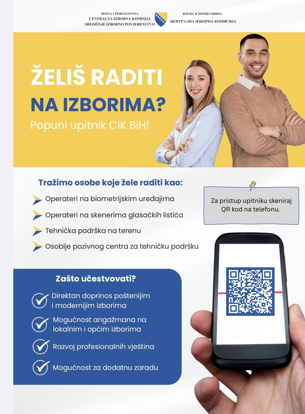 Upitnik za iskazivanje interesa osoba sa tehničkim znanjem i vještinama za angažman u izbornoj administraciji Bosne i Hercegovine se može popuniti OVDJE!